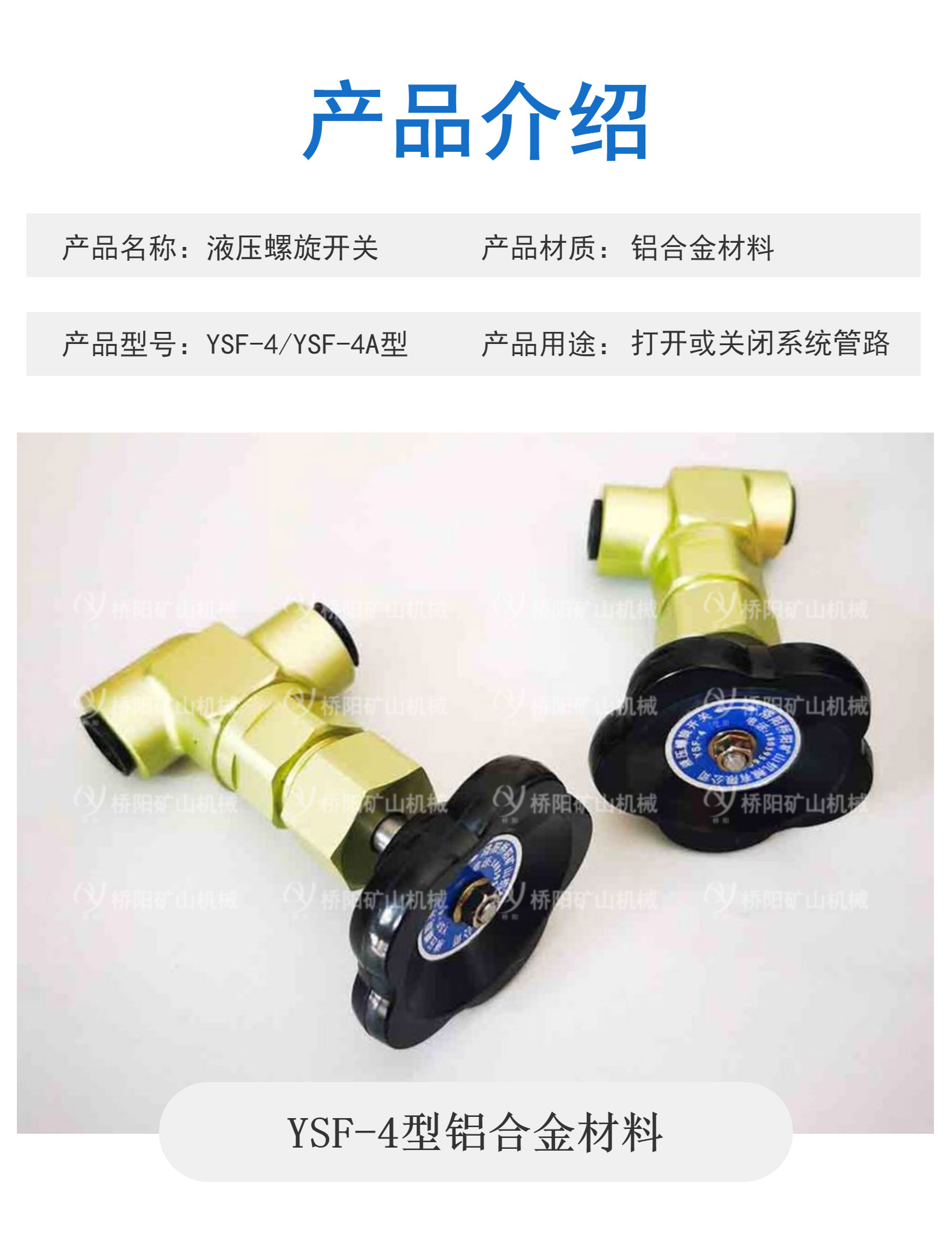 YSF-4型液压螺旋开关主要用于液压系统中,以接通或关闭管路,是液压站和提升机调绳油缸间的部件。可加装压力传感器,用以检测管路压力并参与实现报jing和自动控制。