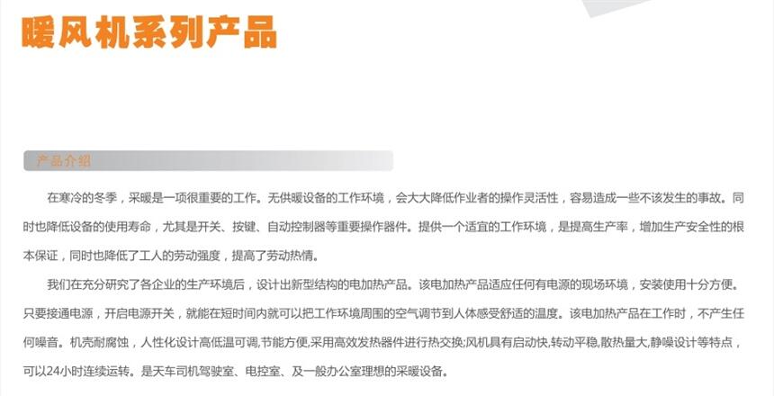 B天车高效节能暖风机,适用于任何有电源的现场环境,安装使用十分方便,只要接通电源,并开启电源开关,就能送出温暖徐徐微风,由于采用主动式热交换方式,在短时间内就可以把工作环境周围的空气升到人体感应舒适的温度。本机壳体喷塑处理,耐环境侵蚀;采用高效发热器件进行热交换;风机具有启动快,转动平稳,风量大,静音设计等特点。