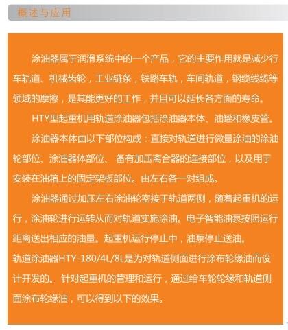 ? 轨道涂油器HTY-180/4L是为轨道侧面进行涂布轮缘而设计开发的,针对起重机的管理和运行,通过给车轮轮缘和轨道侧面涂布轮缘油。