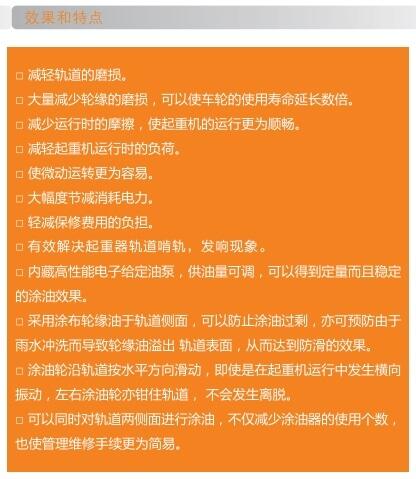 ? 产品介绍:涂油器属于润滑系统中的一个产品,它的主要作用就是减少行车轨道、机械齿轮、工业链条、铁路车轨、车间轨道、钢缆线缆等领域的摩擦,是其能更好的工作,并且可以延长各方面的寿命。HTY型起重机用轨道涂油器包括凃油器本体、油罐和橡皮管。涂油器由左右各一对组成涂油器通过加压左右涂油轮密接于轨道两侧,随着起重机的运行,涂油轮进行运转从而对轨道实施涂油。