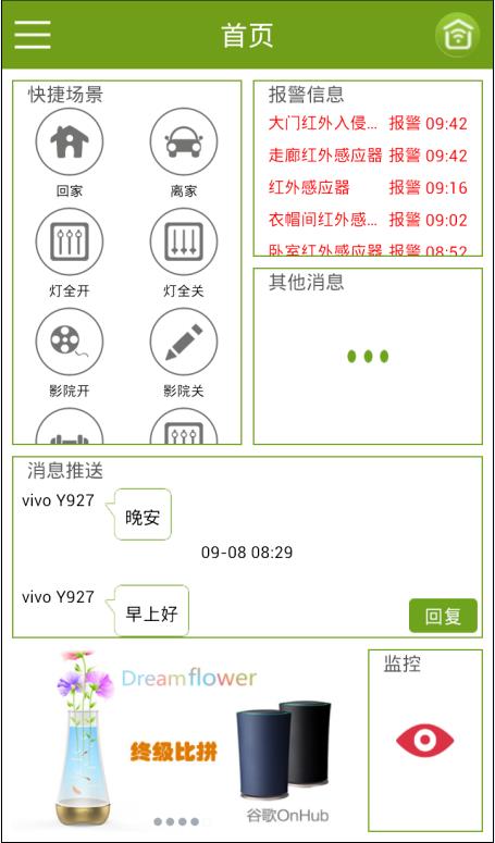 点击APP图标进入软件,首先映入眼帘的是5个版块:快捷场景、报警信息、其他消息、消息推送和监控。分类很简洁,接下来为大家介绍各个版块发挥的作用。