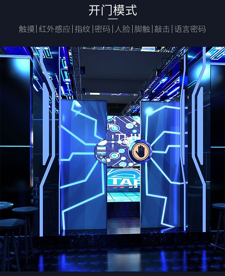酒吧轻奢触摸机关发光门推动结构包含底托和起码两个直流外转子电机,上述直流外转子电机沿推动结构运动方向的两边对称安装,上述直流外转子电机包含内定子、外转子和设于上述外转子外周的防滑隔垫物,上述内定子与上述底托固定衔接,上述直流外转子电机直接作为上述推动结构的动力驱动轴。上述感应门包含门扇、配电系统和推动系统,上述推动系统与上述门扇衔接,用以推动上述门扇运动,上述推动系统包含上述实施例中任一项上述的推动结构;上述配电系统包含纠偏控制器和控制线路板,上述控制线路板各自与上述纠偏控制器和上述推动结构中的直流外转子电机电衔接。上述纠偏控制器为电磁感应导航仪、激光导航仪、红外导航仪和电子罗盘中的一种或多种。上述推动结构还包含设于上述直流外转子电机里面的部位转速检测传感器,上述部位转速检测传感器与上述控制线路板电衔接,用以检测直流外转子电机的运转状态。