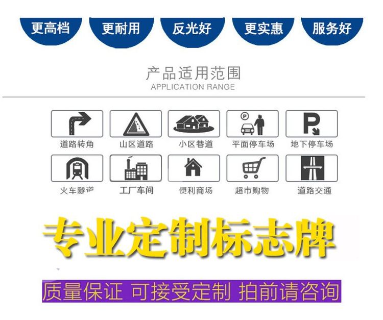 材质:铝板、铝塑板、pvc板、镀锌板、玻璃钢板等 厚度:1.0mm、1.2mm、1.5mm、2.0mm。 规格:圆型牌·三角型牌·方型牌等(按国标制作,亦可根据客户具体需求制作) 反光膜级别:按国标图案贴反光膜(工程级、高强级、超强级)。
