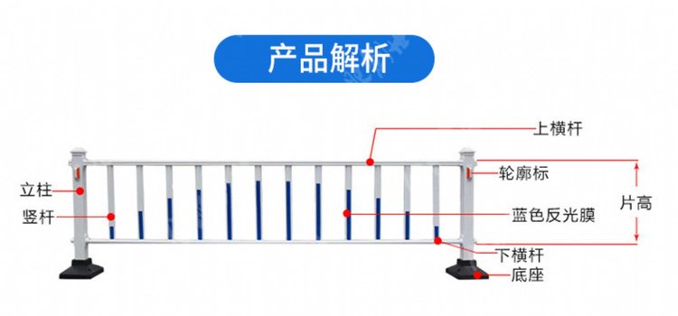 结构:市政交通护栏是由N个倒U形相互连接与两端立柱和底部横支撑连接组成,多用铸铁底座或预制浇注稳固。