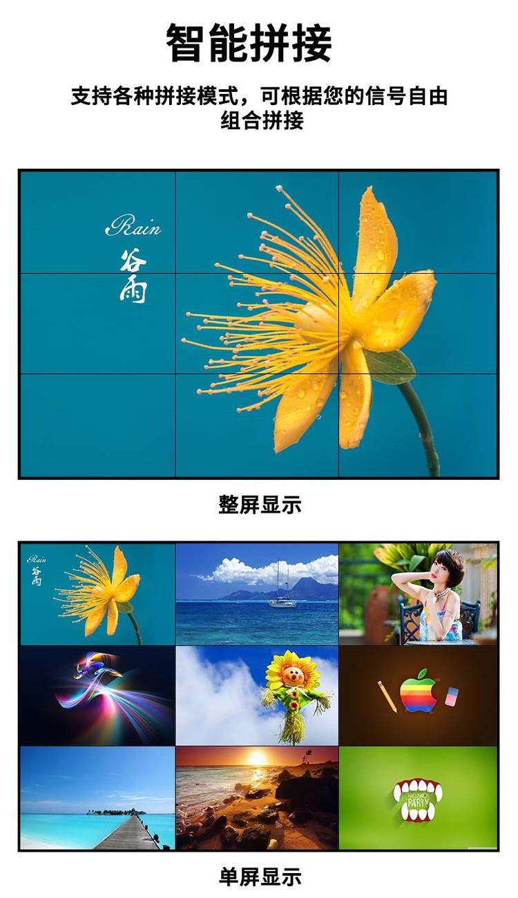 液晶拼接屏的亮度一般非常高,但还是有限,所以选择安装液晶拼接屏的环境周围的光线不能太强,如果光线太强的话,则有用户可能看不到屏幕上的画面。屏幕附近可能射入的光线(如窗户),必要时要进行遮挡,同时设备运行时灯光特好关掉,以 设备的正常运行。在拼接屏屏幕正前方不要安装灯,安装筒式灯即可。