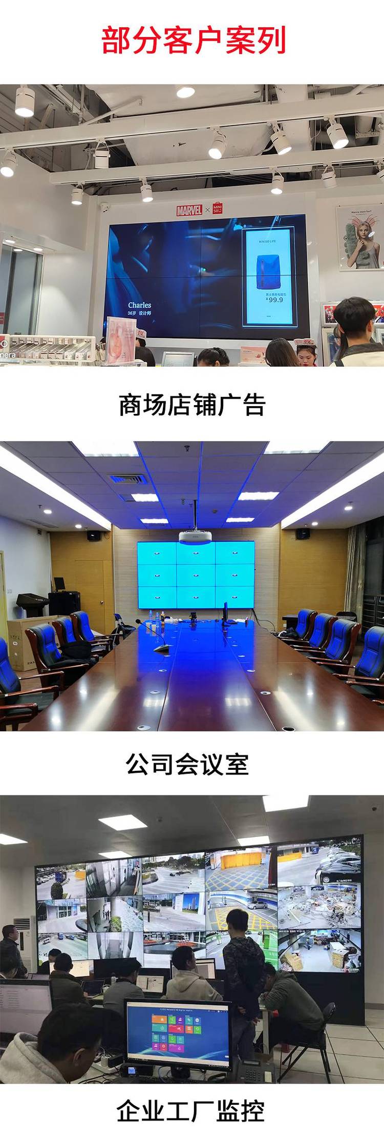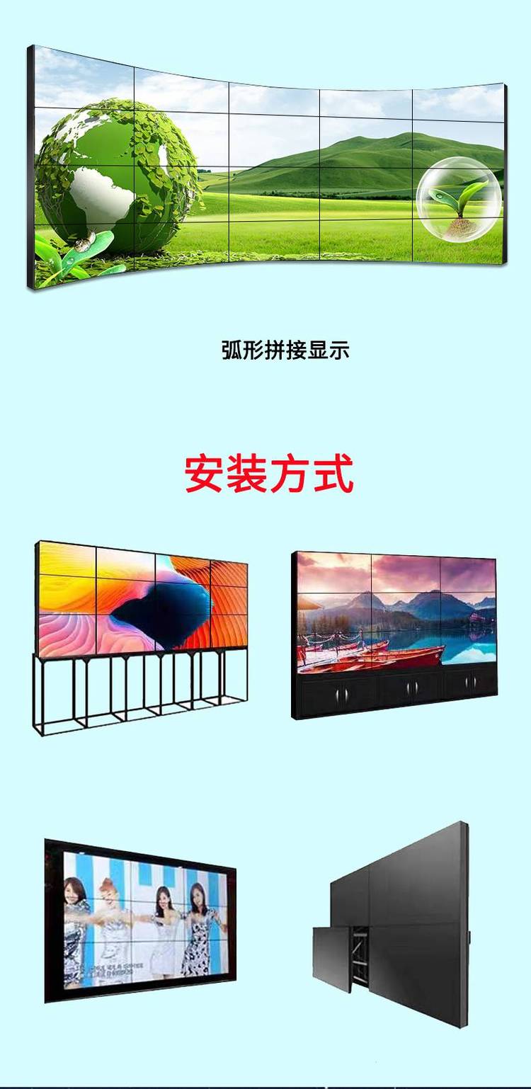 ?????? 液晶拼接墙被应用于:监控、电信、公共事业、过程处理、交通控制、安防监控以及、舞台、电视演播厅、股票、大型会展、商场、银行、办公大厅、公司迎客屏、专卖店、调度指挥等。