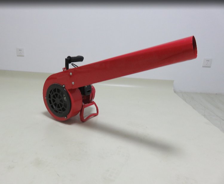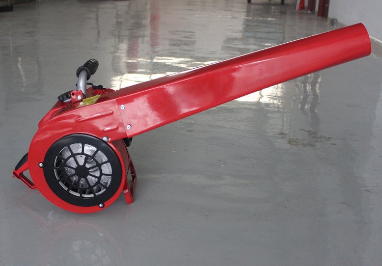 机器由发动机和风机及背挂部件组成;由小型二冲程汽油机直接驱动连接在输出轴上的离心式叶轮高速旋转,将外部空气经防护罩整流吸入后增压加速并通过风机蜗壳和风筒形成强有力的高速空气射流,用以吹击火焰,使燃烧物温度骤降隔离火焰,破坏其继续燃烧的条件,达到灭火目的.