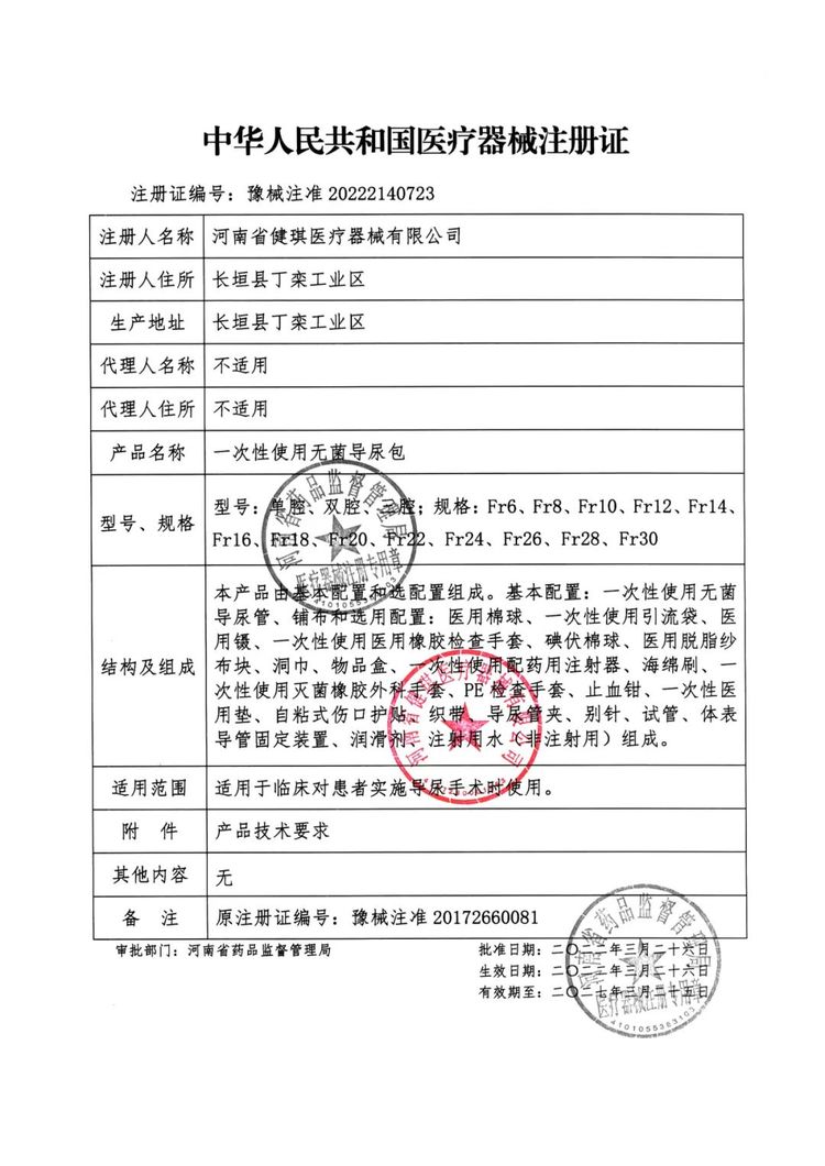 3、一次性使用引流袋应为取得医疗器械注册证的合格产品。