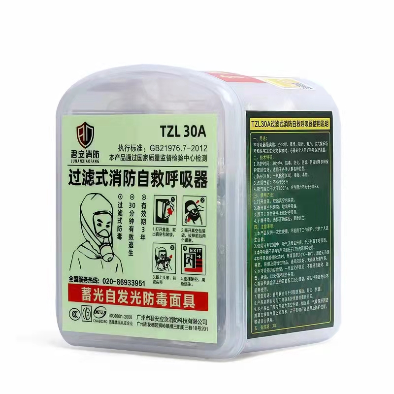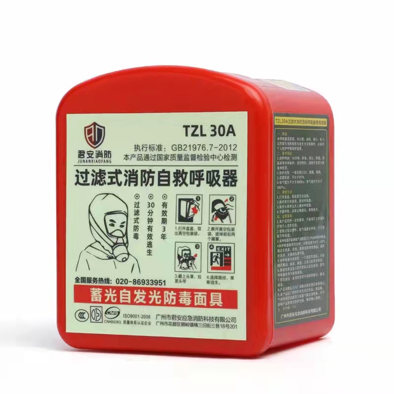 君安牌TZL30A型过滤式消防自救呼吸器就是一种保护人体呼吸器官不受外界有毒气体伤害的专用呼吸器,它利用滤毒罐内的药剂、滤烟元件,将火场空气中的有毒成份过滤掉,使之变为较为清洁的空气,供逃生者呼吸用。本产品按《中华人民共和国国家标准》 GB 21976.1-2008和GB 21976.7-2012的技术要求制造。