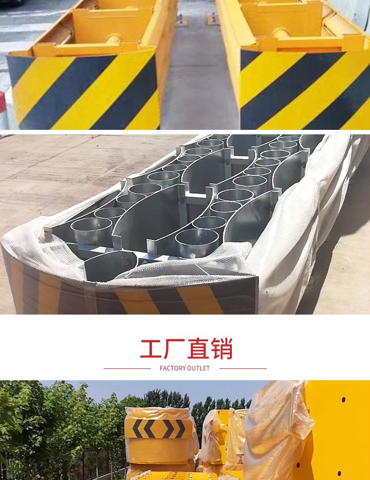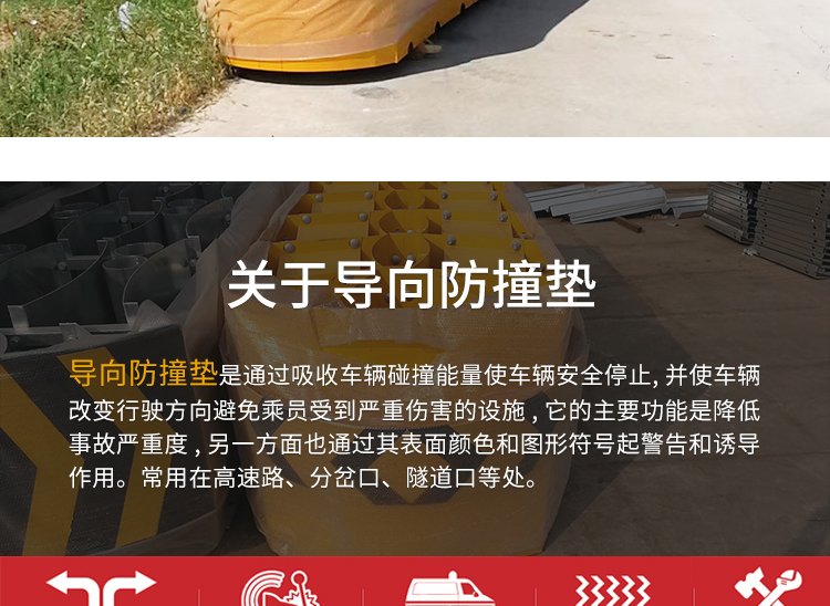 防撞垫可分为动能原理和动量守恒原理两大类。动能原理防撞垫是通过设置在防撞物前的可破坏的或产生塑性变形的材料或结构,?通过缓冲或吸能从而吸收行驶车辆的动能,?这种结构需刚性支撑或阻挡,?使吸能材料或结构产生变形以减少对车辆的撞击力。另一种是按照动量守恒定律,?通过设置在防撞物体前的一些装砂、装水容器转移失控车辆的动量,?起到缓冲作用的结构。