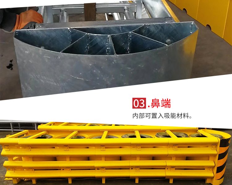 动能原理防撞垫一般由端头、?吸能材料、?两侧护梁,?横隔板和后背支撑组成,?车辆碰撞防撞垫后,?通过端头部分的变形、 吸能材料来吸收碰撞车辆的能量,?后背支撑用来抵抗车辆的冲力。吸能材料一般是泡沫材料或橡胶材料,?这种原理的防撞垫对于车辆的正面和侧面碰撞均有良好的吸能效果和导向作用,?并且该系统在被碰撞后,?主要部件均可重复使用,?维修方便快捷且费用低,?缺点是初装稍微复杂且成本较高。