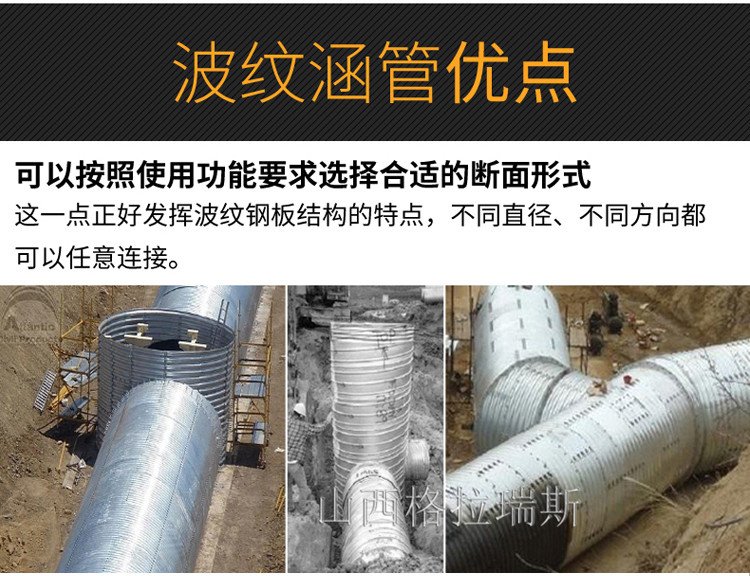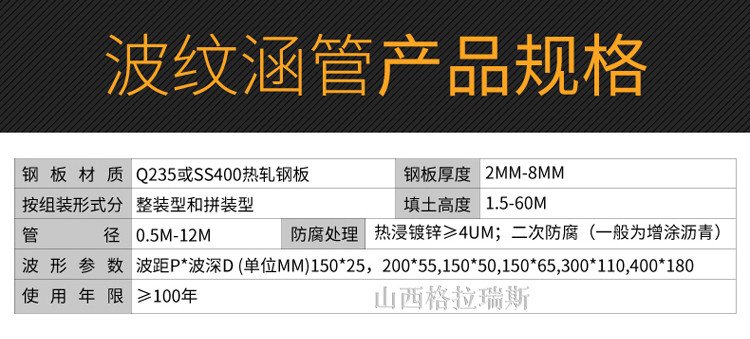 ? ? ? ?山西格拉瑞斯专业生产道路河流地下管道钢波纹涵管、路桥专用波纹涵管、整装波纹管、拼接波纹管、涵洞用波纹管、镀锌波纹钢管、大口径金属波纹管等,欢迎您来电咨询