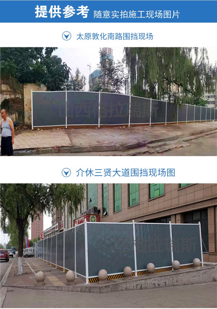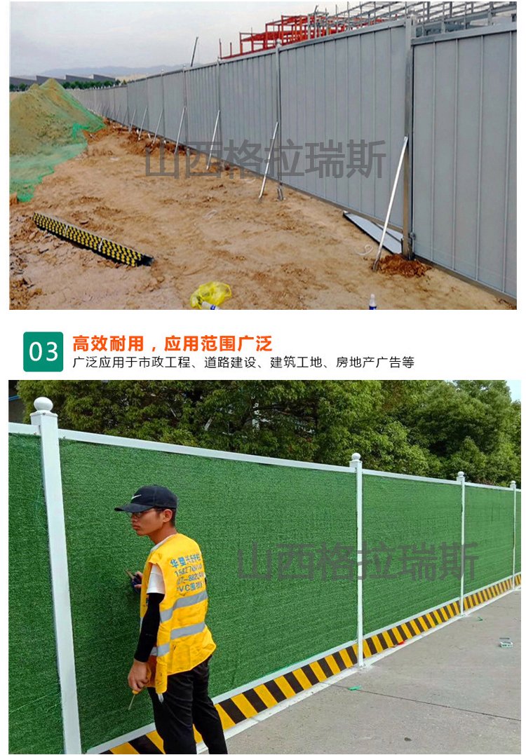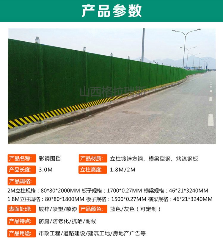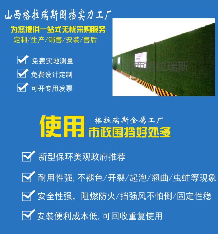 ? ? ? ?山西格拉瑞斯围挡厂家专业生产市政工程围挡、彩钢围挡、施工围挡、工地围挡、绿色草坪围挡、小草印花围挡、瓦灰色围挡、道路施工围挡、铁皮围挡、1.8米高围挡、2米高围挡、2.5米高围挡等各种规格款式围挡供应。