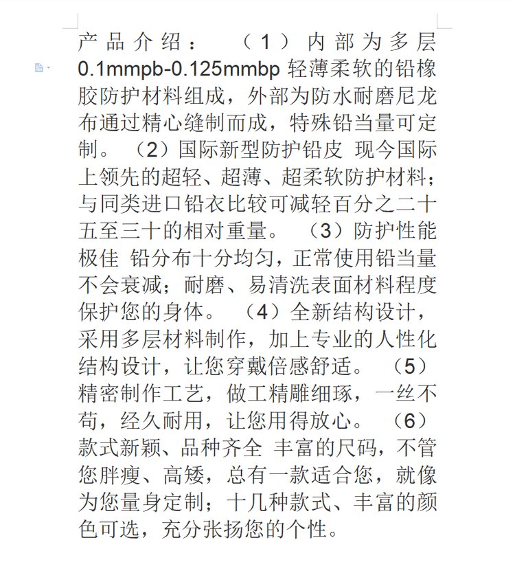 产品用途 | 保护人体防止受到射线侵害 | ||