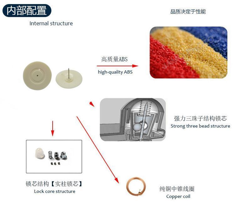 博航SD1015超强性能小圆射频防盗扣(俗称:射频防盗扣、射频磁扣、射频防盗硬标签、射频耗材等)采用全新ABS工程塑料外壳,纯铜线圈,内部配件制造,抗老化性能强,检测率高,拉力在48KG以上,抗老化性能强使防盗扣使用寿命长,一般可长达6年以上,减少劣质产品所带来的重复购买率。同等设备时比其它同类产品检测间距宽50~80MM。