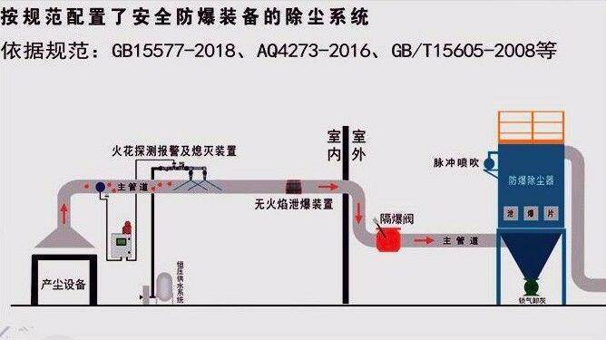 ? ? ? ? 在环保检查越来越严的今天安全越来越引起人们的重视,在以往我们常采用在除尘器上安装泄暴板来泄放除尘器内因粉尘暴炸产生的超压。但这样安装在室内设备是被安监所不许可的,因为这样会危害周围人员和周围设备,暴炸产生的压力波和火焰可能会引起二次暴炸或多次暴炸,产生更大的风险。所以除尘器单单采用防爆板是不可-靠的,因此我们建议除尘器采用无焰泄暴 隔离技术(这种方案比较经济),或抑爆 隔离技术来保护生产的安全。