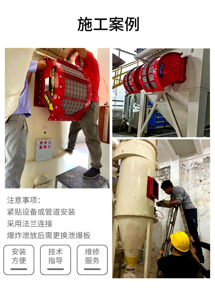 安装方式:紧贴设备或管道,采用法兰连接;炸泄放后需更换泄爆板;