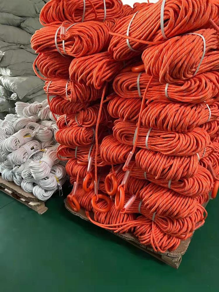 丙纶长丝,内置高分子多股缠绕,可漂浮水面,直径12MM,夜间具有反光同时具备蓄光的功能,拉力大于18KN。一段配置安全钩,一段配置救生环。颜色:橘红色。长度可根据要求制作。