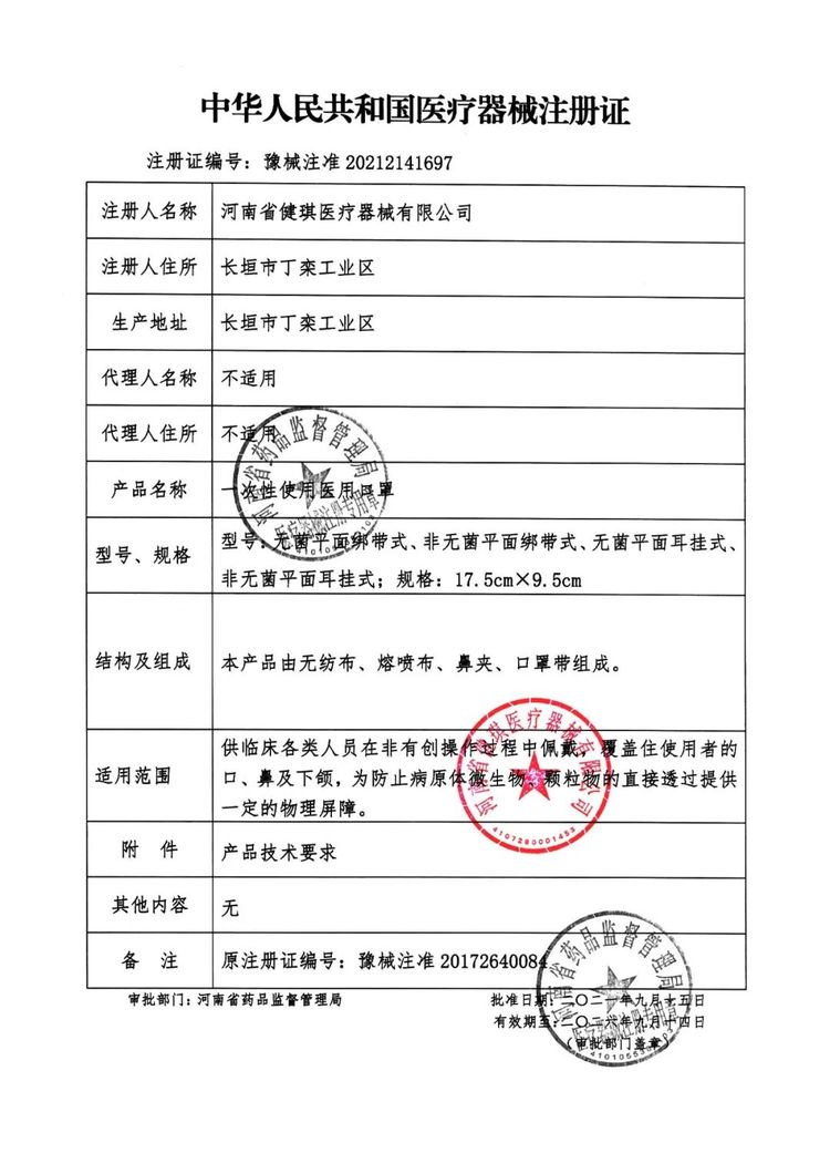 适用范围 | 供临床各类人员在非有创操作过程中佩带,覆盖住使用者的口、鼻及下颌,为防止病原体微生物、颗粒物的直接透过提供一定的物理屏障。 | ||