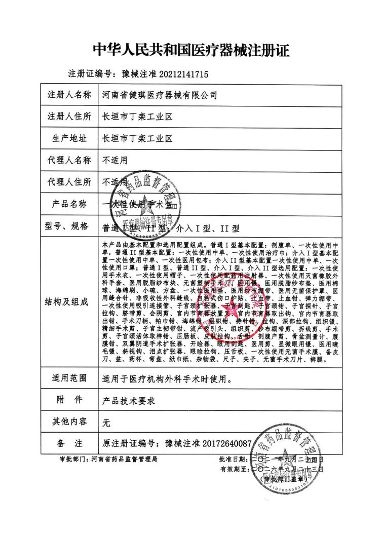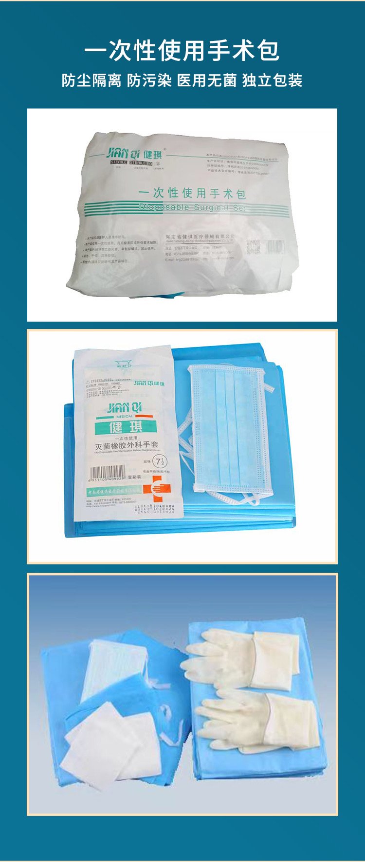产品描述 | 产品医用中单 手术衣 治疗巾 口罩 帽子 纱布垫 棉球 镊子 手术刀 海棉刷等组成 | ||