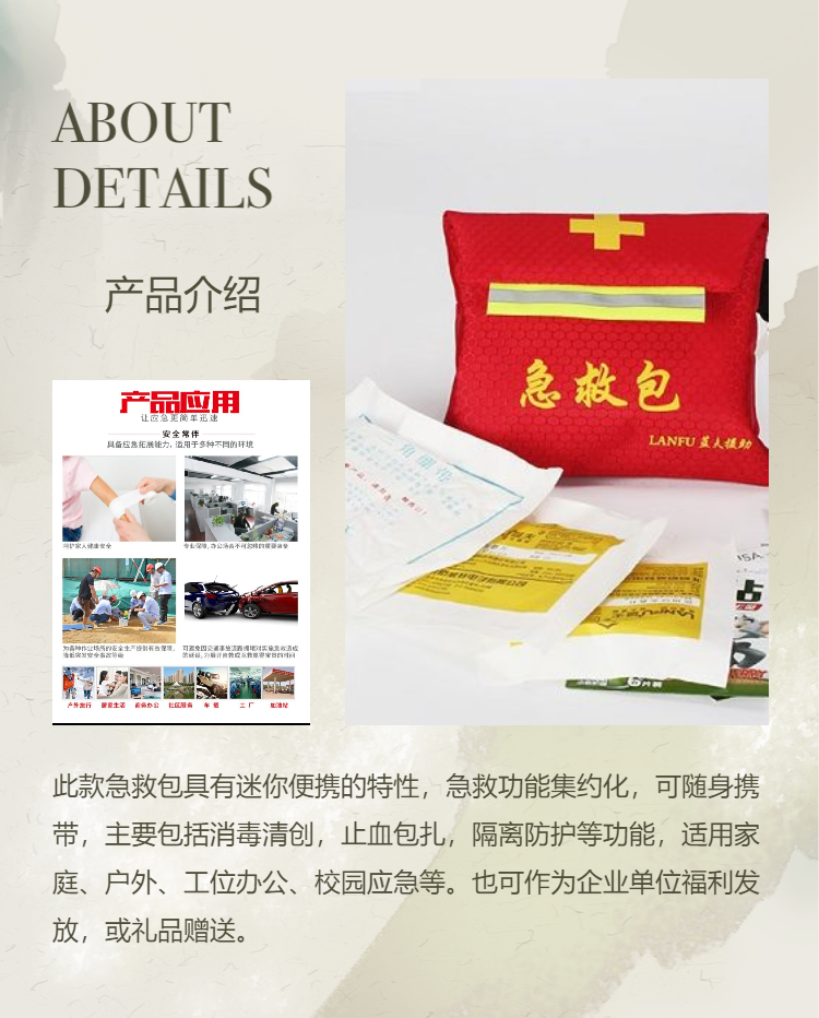 适用场景 | 户外运动、野外作业随身携带,家庭及办公环境应急急救 | ||