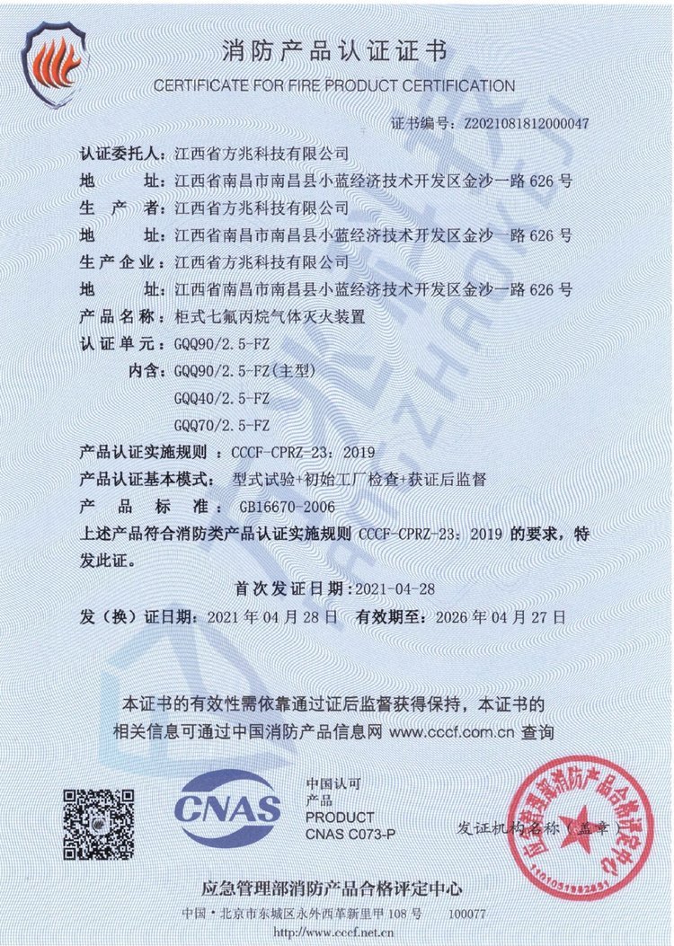 【方兆】计算机房柜式无管网七氟丙烷气体灭火系统GQQ90/2.5 品牌 | 方兆科技 | ||