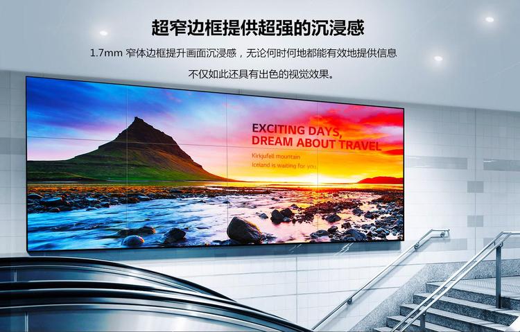????? 55寸1.7mm液晶拼接单元,采用三星/LG/京东方超窄边面板,直下式LED背光源,显示单元亮度更加均匀,无边界暗影现象。屏幕之间拼缝仅仅为1.7mm。高亮度,700cd/m2,工业级设计,使用寿命远高于普通家用液晶显示单元,可长达60000小时。