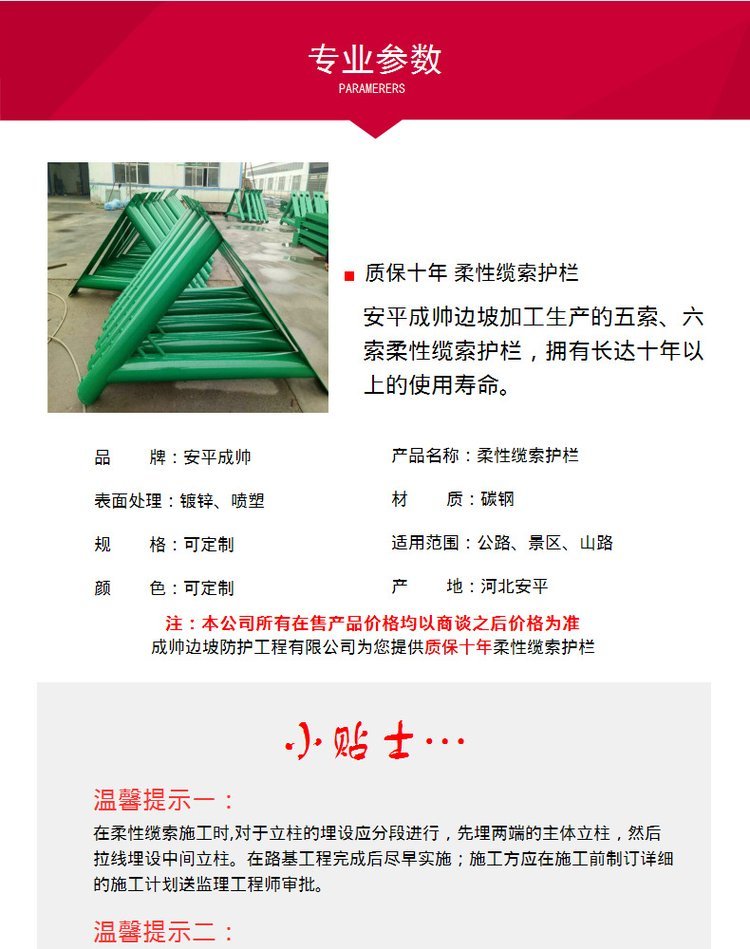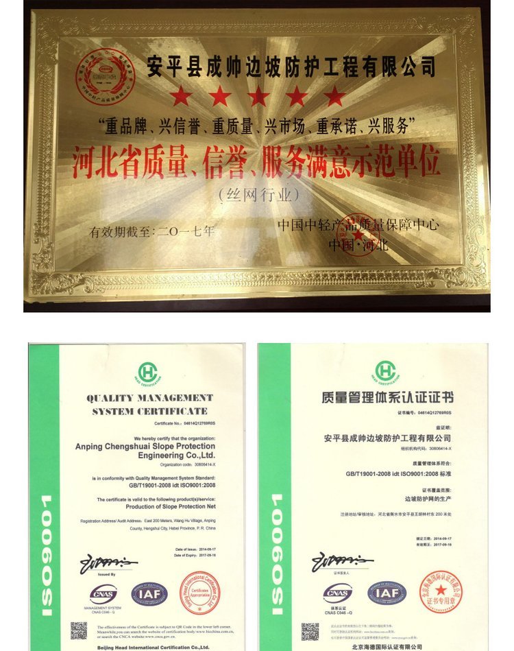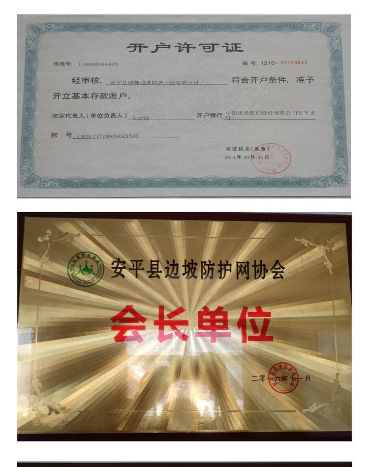 成帅边坡防护工程有限公司创建于2008年,是集生产、销售、安装、售后一条龙服务的公司。成帅边坡以诚信为本、客户至上为经营理念。赢得了国内大片市场,获得了良好的信誉和口碑。成帅边坡生产的柔性缆索、高强度钢丝绳网、被动环形网、绞索网等各种路桥边坡防护系列产品深受广大用户的欢迎。本公还是安平边坡防护网协会会长单位,所售产品广泛用于路桥、边坡、景区、山区、等存在潜在自然灾害发生场所的安全防护工作。成帅边坡防护工程有限公司以“客户为本,求实开拓,永无止境 ”为奋斗目标,不管对客户还是对公司员工,始终坚持双赢的原则,致力于建立长期的合作关系。自公司成立以来,公司吸引了一批工程技术、销售和客户服务人才,我们坚信“客户的信赖是企业的根本”,以优质产品和周到服务取信于各新老客户,热忱欢迎广大客商光临惠顾!