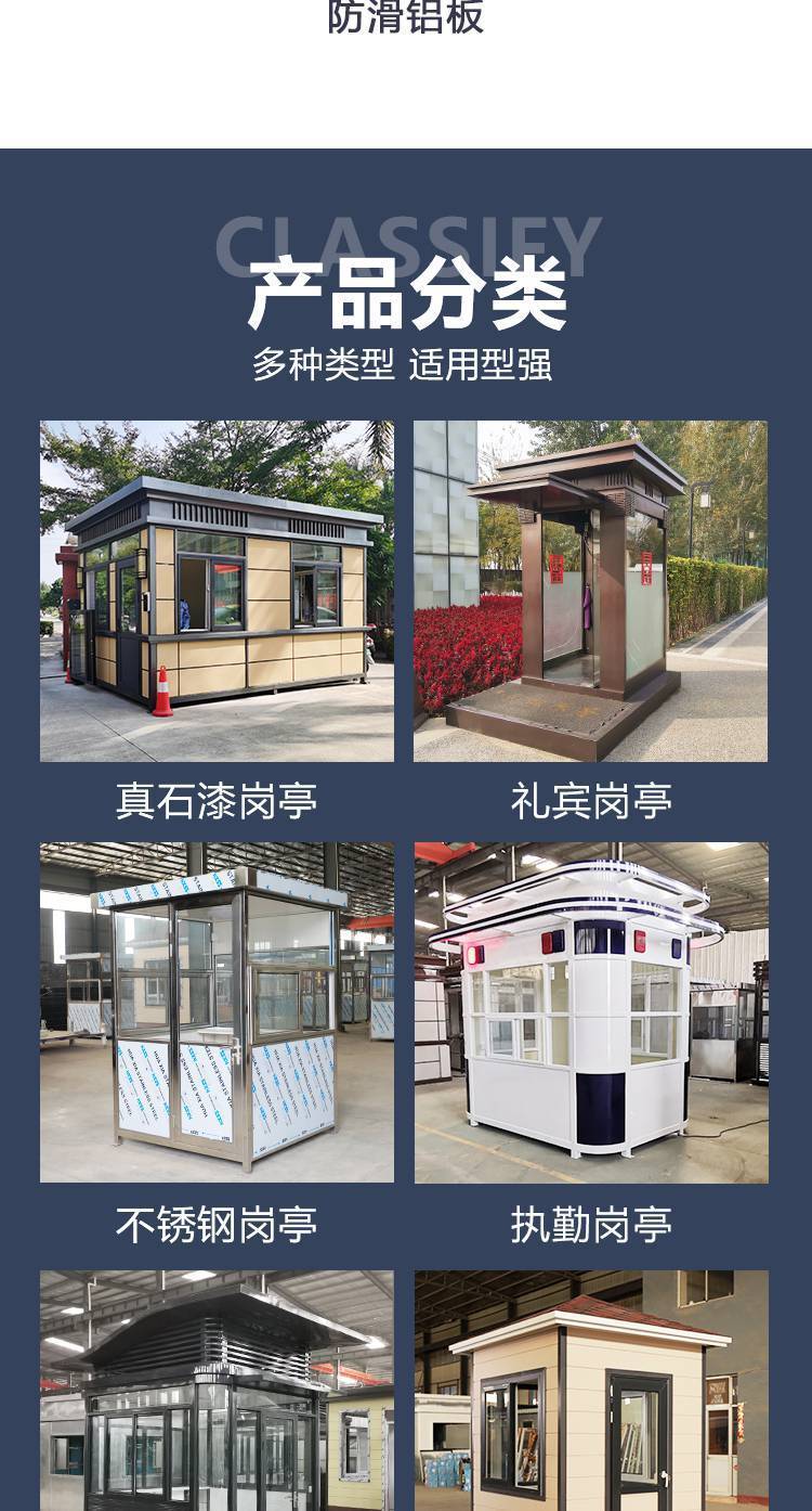 1.保安岗亭、收费岗亭、治安岗亭、执勤亭、站台岗亭、门卫室、售货亭、吸烟亭、移动厕所、垃圾分类房、大型移动办公室等;