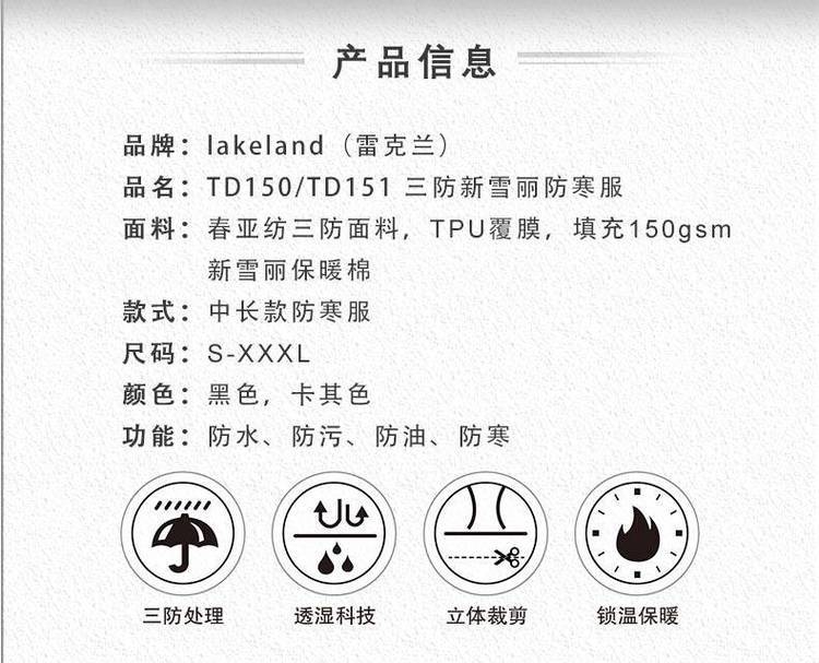 雷克兰TD150/TD151中长款新雪丽棉户外防水防油防寒服,采用春亚纺三防面料,TPU覆膜,可防水、防污、防油;填充150gsm新雪丽保暖棉,内衬银色圆点反热锁温。