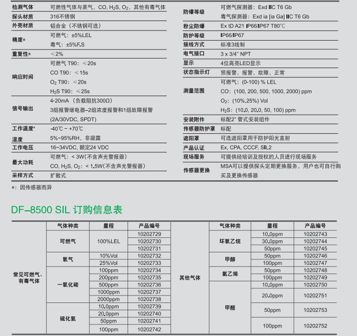梅思安固定式DF8500 SIL氧气气体探测器10202733规格:
