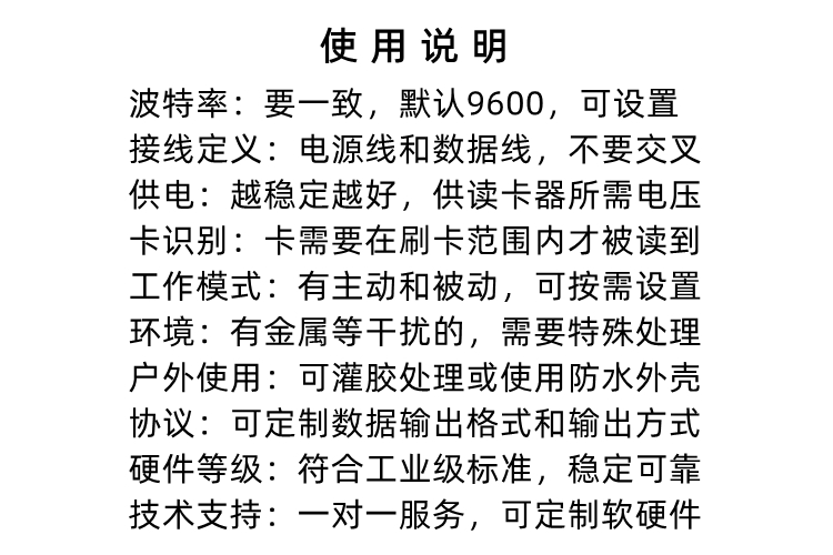 3、支持协议:ISO14443A(选配ModBus-RTU)