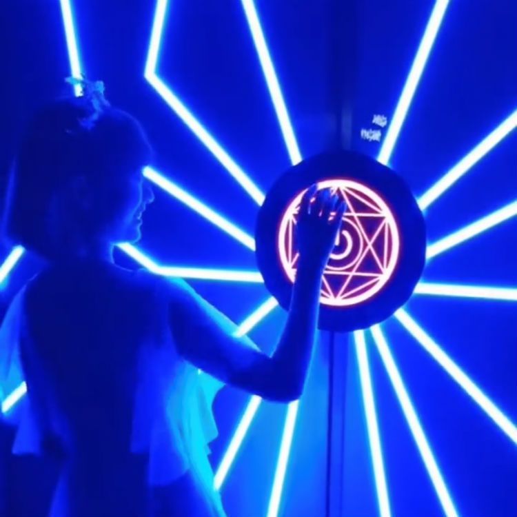 酒吧门包含多个门扇单元和衔接邻近两个上述门扇单元的固定件,上述门扇单元包含由塑料板材制成的起码两个门扇本体、夹设于上述门扇本体上下两边的由铝合金材料制成的衔接横框和各自夹设于上述门扇本体左右相对两边的由铝合金材料制成的强化件;上述门扇本体的左右两边均形成厚度高于上述门扇本体的加厚部,上述强化件包含夹持上述加厚部的夹壁和由夹壁远离上述加厚部一边延展的呈空心圆柱状的衔接柱;上述固定件为铝合金材料制成,上述固定件包含固定件本体和由上述固定件本体的左右两边各自延展形成的呈弧形开口结构的插槽,上述衔接柱卡置于上述插槽内,上述门扇单元以上述衔接柱为轴在上述插槽内旋转至使得邻近两个上述门扇单元呈相互平行间距安装或呈处在同一直线安装。上述门扇单元包含起码两个门扇本体,上述门扇单元还包含衔接邻近两个上述门扇本体的由铝合金材料制成的衔接竖框,上述衔接竖框各自夹持邻近两个上述门扇本体相互接近侧的两个加厚部。上述衔接竖框包含竖框本体和由上述竖框本体相对两边各自延展形成的竖框夹壁,接近上述衔接竖框的两个上述加厚部分别卡设于两个上述竖框夹壁内。
