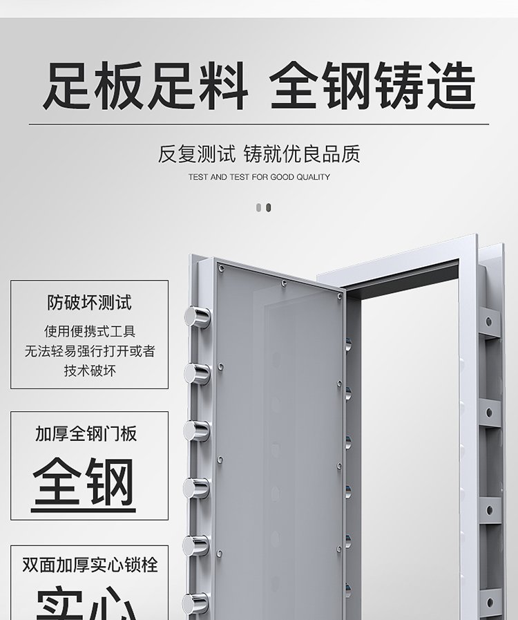 金库门门套呈龙门架结构安装。上述固定结构包含固接在门套外侧的安装座二,安装座二的下边配有导向筒,导向筒固接在安装座一上,导向筒的顶部开有水平槽,导向筒的开口端与阶梯埋孔同轴安装,在导向筒内滚动配有滑板,滑板的顶部固接有V形驱动杆,V形驱动杆的连接端旋转在安装座二上,V形驱动杆的一边穿过水平槽与滑板固接,V形驱动杆的另一边为自由驱动端,在滑板与导向筒的端壁中间固接有扭簧部件,背离扭簧部件的滑板的一边固接有衔接杆,衔接杆穿过阶梯埋孔同轴固接有紧固销,紧固销伸缩在相应的紧固槽内。根据在门体内安装安有蜗杆的滑轨,配合蜗轮,便于开启和关闭门扇,根据在安装座一上安装左右对应的固定结构,根据V形驱动杆的旋转,推动滑板在导向筒内滚动,进而驱动紧固销伸缩在紧固槽内,便于安装拆卸活门坎。