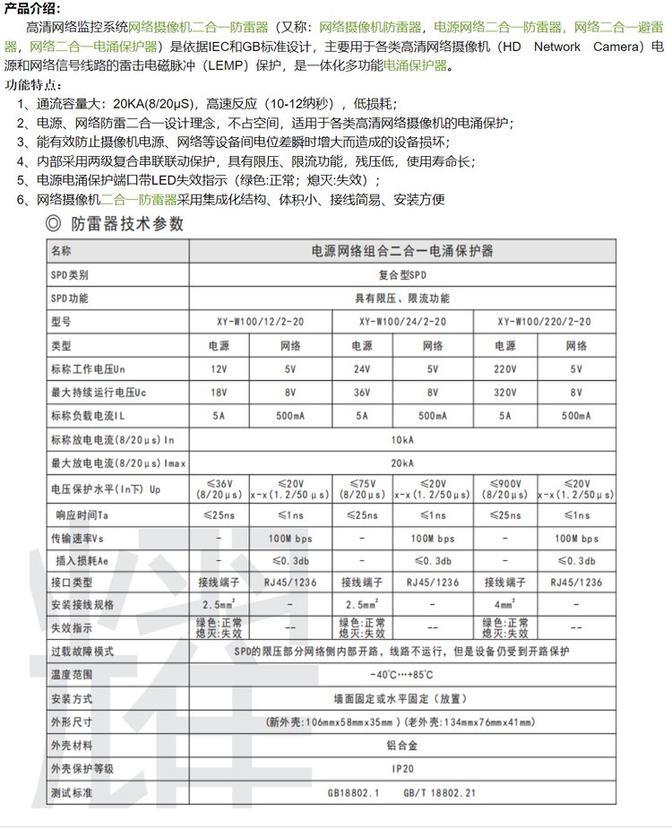 雷电保护区 | 主要用于各类高清网络摄像机 | ||