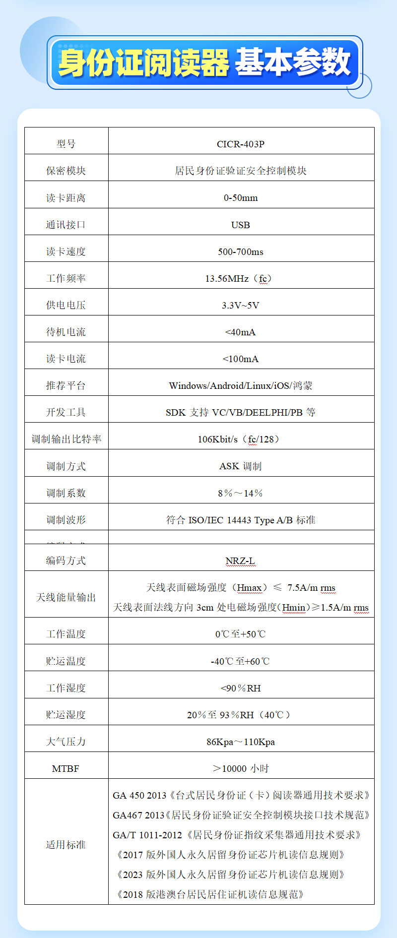 工作频率 | 符合ISO14443 Type B标准;13.56MHz±7kHz(fc) | ||