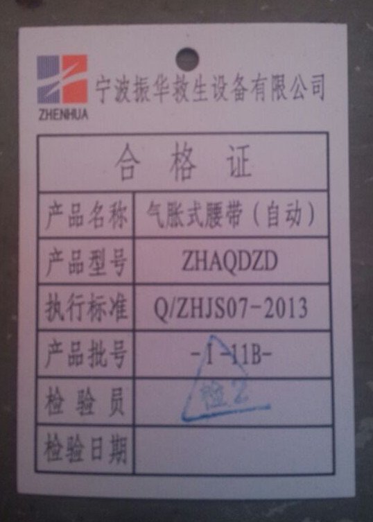 ZHAQDZD型为自动充气型,遇水后能在5秒钟内自动充气膨胀,形成一个马蹄形的救生圈挂在腰间,也可手拉充气;ZHAQDSD型为手动充气型,按照指示方向(气瓶的反方向)将拉臂用力一拉,气室就会立即充气成型,起到救生的作用。