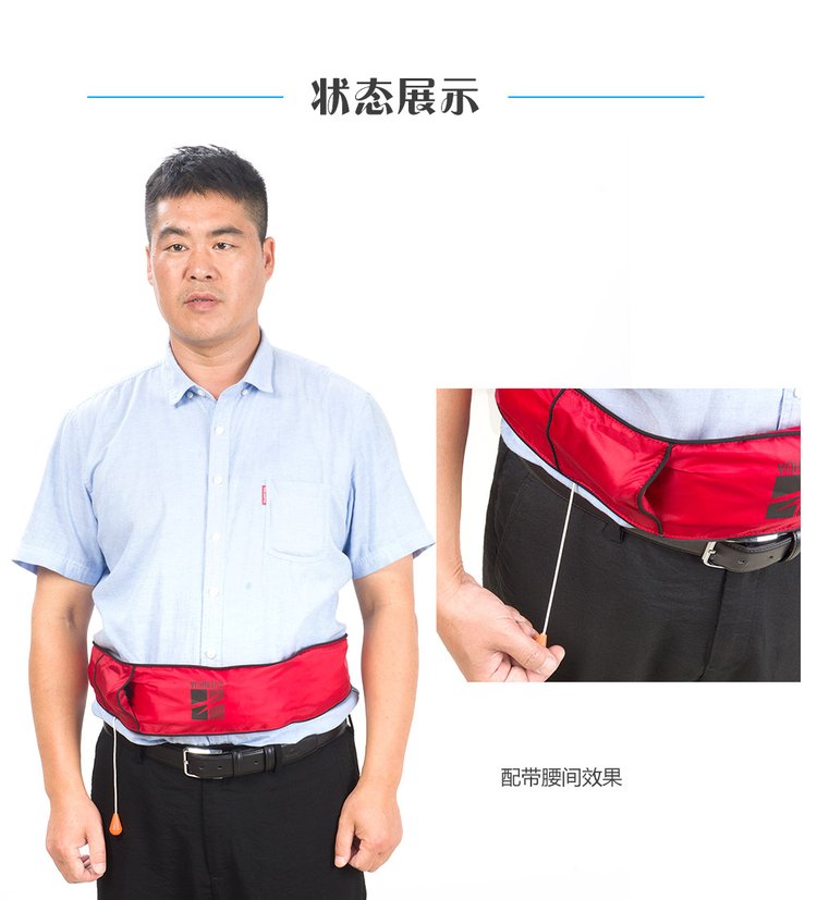 本气胀式腰带是一种休闲救生用品,主要由外套、气室、自动(或手动)充气装置、嘴吹气管和CO2贮气瓶等组成。使用前,其外形象一条狭长的带子,手动拉臂暴露在外面。穿着时,只须将腰带两端的卡扣在腰间连接起来并调节合身,然后调整卡扣至腰后部位置即可。