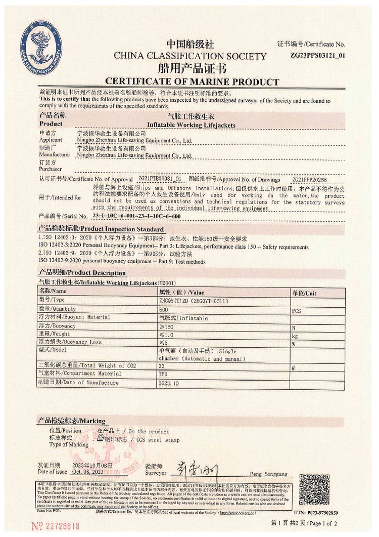 新CE认证ZHGQYT-0511,联系电话15888047560潘先生 性能特点:单气室气胀式救生衣,是按照欧洲标准ISO12402以及EN396:1993/A1:1998设计制造,并参照国际标准MSC.81(70)的有关要求。它由一个尼龙复合布TPU材料制作的气室、自动(或手动)充气装置、CO2贮气瓶、嘴吹气管和外衣套等组成,在遇险落水的紧急情况下,自动充气装置可在5秒钟内对气室充气,也可拉手动拉绳对气室充气,以保证落水人员的安全。产品体积小、重量轻、穿着舒适、使用方便,适用于各类水上航行船舶作业人员救生用,也可以作为个人防护用品休闲救生用。ZHGQYT-0511、??ZHGQYT-0521两款救生衣通过德国劳氏船级社CE认证。 |