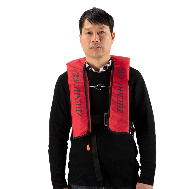 ZHGQY(T)ZD(ZHGQYT-0511)型气胀式工作救生衣,符合ISO 12402-3:2020和ISO 12402-9:2020《个人浮力设备》标准要求。它由一个尼龙布复合TPU气室、自动充气装置、CO2贮气瓶、外衣套和嘴吹气管组成,在遇险落水的紧急情况下,自动充气装置可在5秒钟内对气室充气,也可以拉动手动拉绳,使气室充气并形成浮力,以保证落水人员的安全。本品体积小、重量轻、穿着舒适、使用方便,适用于各类水上航行船舶作业人员救生用,也可以作为个人防护品休闲救生用。