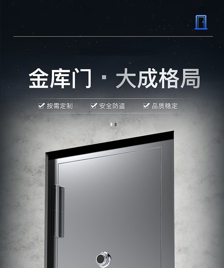 金库门包含有门体和传动轴;上述传动轴与地面垂直;上述传动轴的杆身上套配有多个带座轴承;上述带座轴承与传动轴转动衔接;上述带座轴承与门体相固定衔接;上述传动轴的两边均安装有销轴联动装置;上述销轴联动装置包含有圆环、传动轴、铰轴、导向套、销轴和摆杆;上述摆杆一边与传动轴的侧表层相固定衔接;上述圆环的内孔与摆杆的杆身相匹配;上述圆环套设在摆杆的杆身上;上述导向套的内孔与销轴的轴身相匹配;上述销轴一边穿过导向套后与铰轴一边相固接;铰轴另一边与圆环的外表面相固定衔接;上述传动轴的轴身上固定有门把杆。上述门扇上安装有把手锁紧装置;上述手锁紧装置包含有滚轮、盖体和滑轨;上述滑轨的两边均固定有滑轨固定座;上述滑轨固定座固定在门扇上;上述滑轨沿水平方向安装;上述滚轮与滑轨相匹配;上述滚轮嵌入到滑轨内;上述盖体与滚轮相固定衔接。