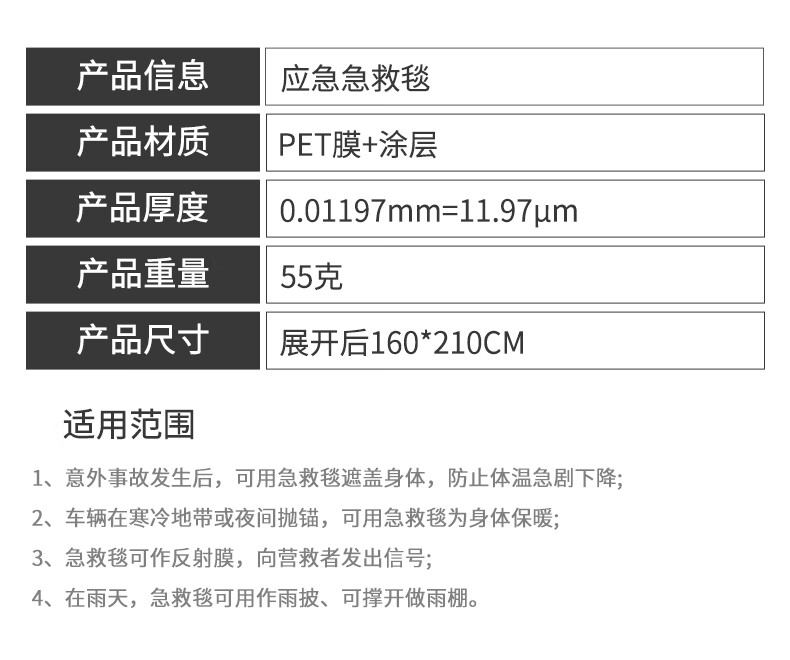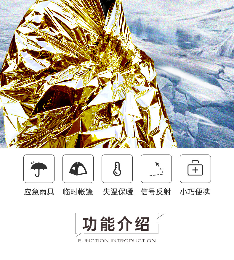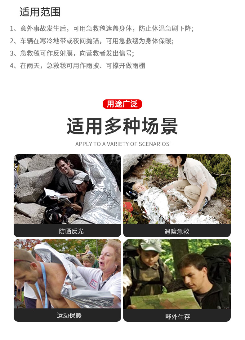 用途意外事故发生后,可用急救毯遮盖身体,防止体温急剧下降