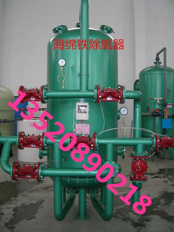 海绵铁除氧器是一种除氧装置,含有氧气的水进入除氧器,穿过海绵铁滤料层,这种特制的海绵铁滤料具有巨大的比表面积,可使水中的溶解氧与铁发生彻底的氧化反应,从而把水中的氧去除掉。