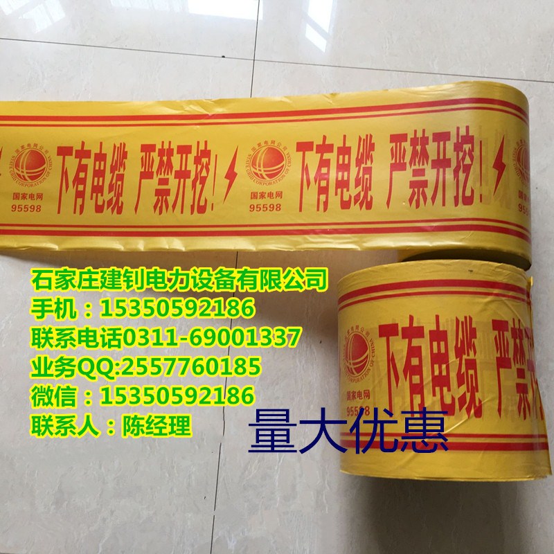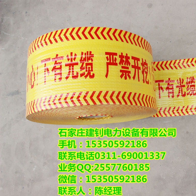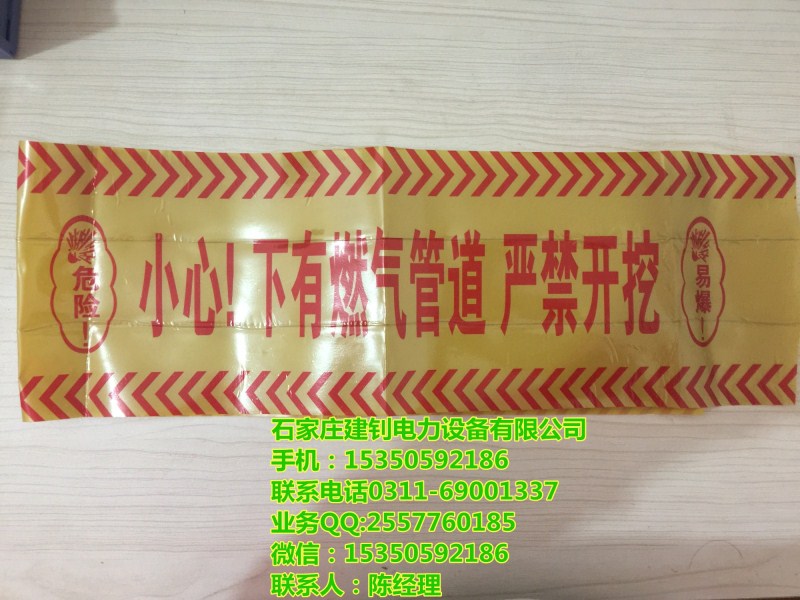 河北建钊电力设备有限公司拥有高科技生产技术及大型生产流水线设备,可以加工5CM—160CM各种规格标示带,标志带,可探测标示带,示踪带,品种齐全,加工销售:燃气管道标示带,给排水管道标示带,光缆标示带,电缆标示带,输油输气管道标示带等地下管线、管网警示标志带。以PE聚乙烯、聚丙烯、防腐膜为主要材料,质量保证,价格优惠,还可根据客户需求印刷警示标语。
