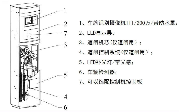 1、道闸(仅道闸一体机适用)、车牌识别、显示、语音、补光一体化设计;