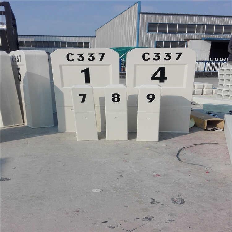 玻璃钢公路百米桩表示公路百米距离,设在公路右侧各里程碑之间,每100米设一个玻璃钢公路百米桩,每1000米有一个里程碑,上面标示着该公路的名称以及公里数,每两个里程碑之间有9个玻璃钢公路百米桩,司机通过里程碑和玻璃钢公路百米桩,可以确定自己的准确位置。玻璃钢公路百米桩地面以上部分,颜色为白色,字的颜色和里程碑上字的颜色一致。玻璃钢公路百米桩、里程桩是在公路沿线,铁路沿线,地下管道沿线,或者是地下电缆沿线。常规的水泥玻璃钢公路百米桩、里程桩、塑钢玻璃钢公路百米桩、里程桩、复合材料玻璃钢公路百米桩、里程桩和玻璃钢玻璃钢公路百米桩、里程桩。