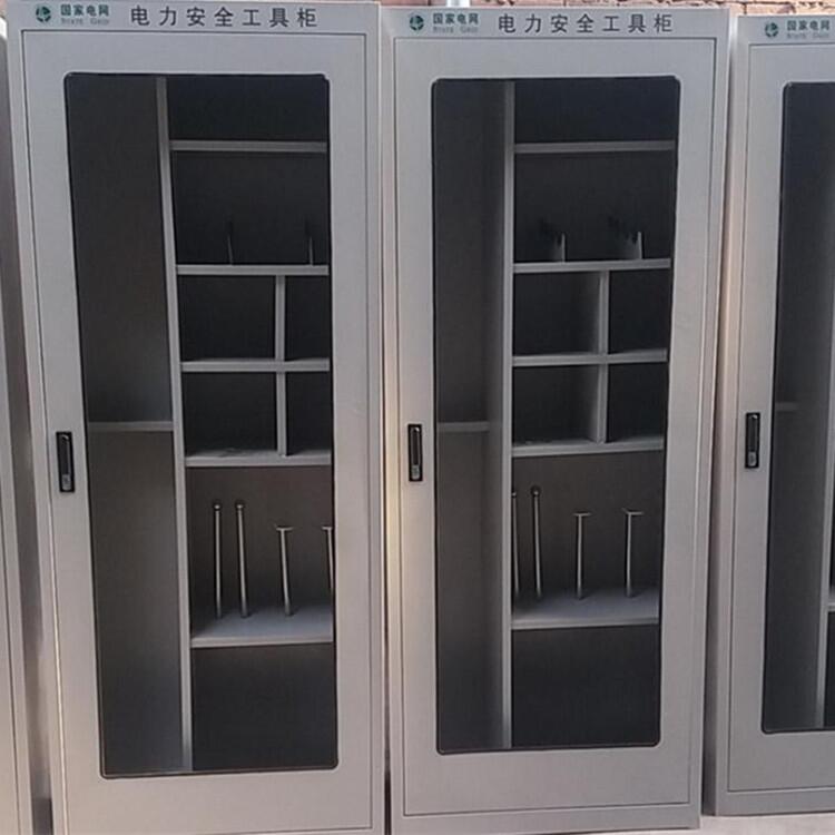 2. 柜体表面为静电防腐喷塑工艺,颜色为驼灰皱,柜门装有通体透明有机玻璃,透过玻璃门可以看到分类有序的各种工器具。