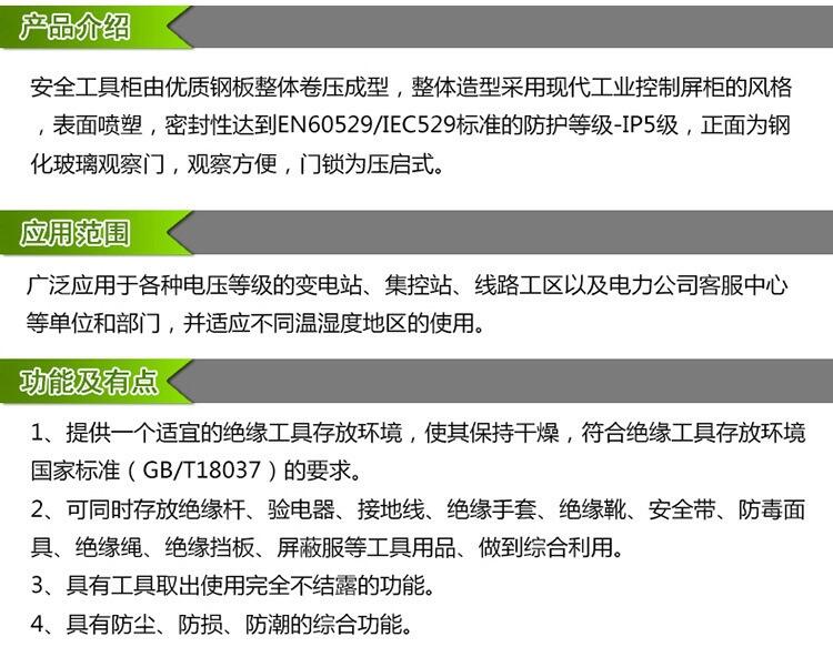 1.可同时存放绝缘杆、验电器、接地线、绝缘手套、绝缘靴、安全带、防毒面具、绝缘绳、绝缘 板、屏蔽服等工具用品、做到综合利用。