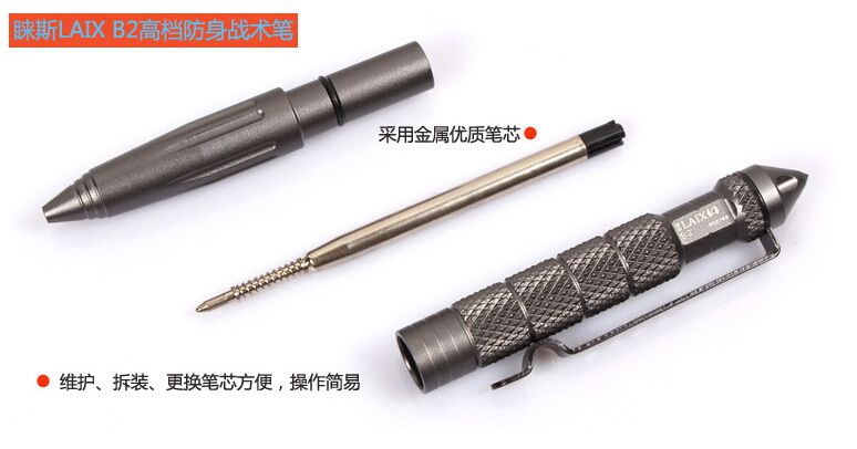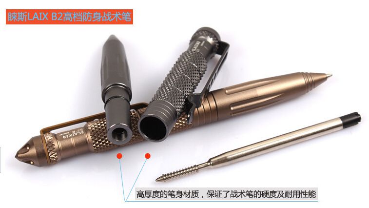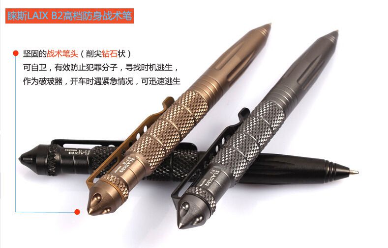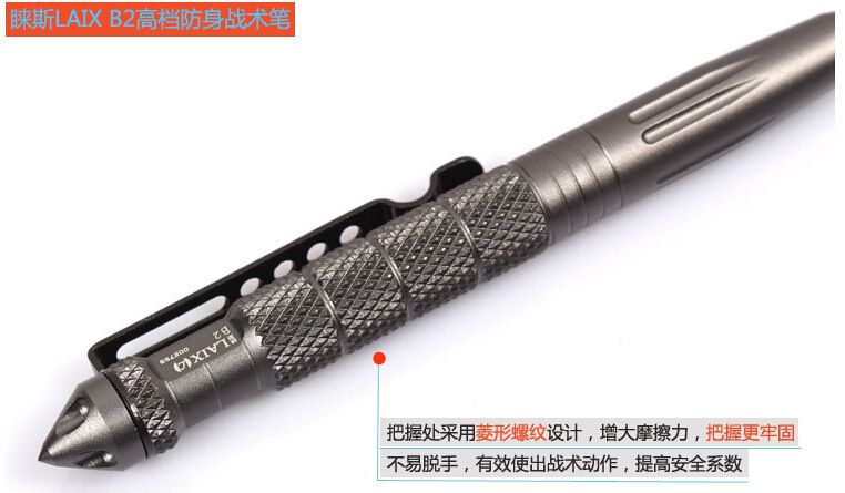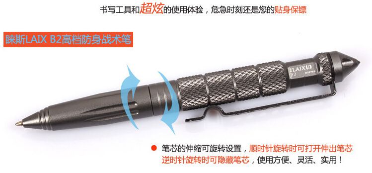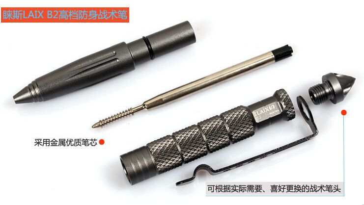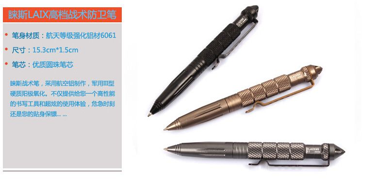 睐 斯laix钨钢头战术笔是一款由睐斯2014根据以战术及户外爱好者的需求而设计生产的一款高性能防身战术笔,是您文武兼备的贴身保镖。安全设计,战 术防卫,笔尖能有效的攻击犯罪分子,造成暂时性伤害,有效的瓦解犯罪分子的顽抗心理,起到防卫作用。面对一些突发性的灾难,如公交车着火、楼房着火等,而 我们身边又没有合适的工具击破玻璃逃生。在这万分危急的时候,如果您携带一只战术笔,那情况就不同了,高硬度不锈钢内嵌钨钢攻击头可以轻松的击碎玻璃,应 急逃生。