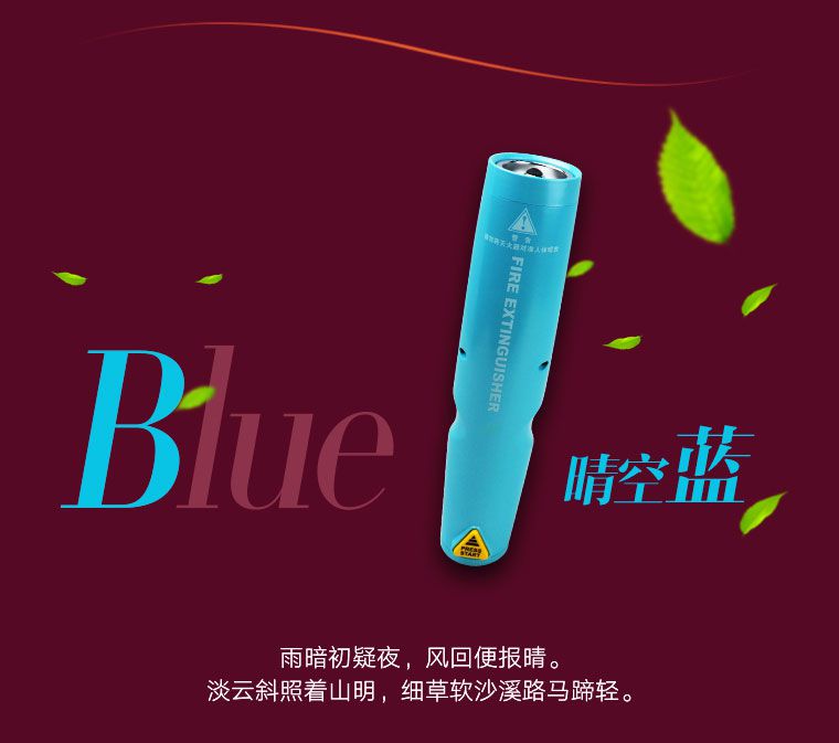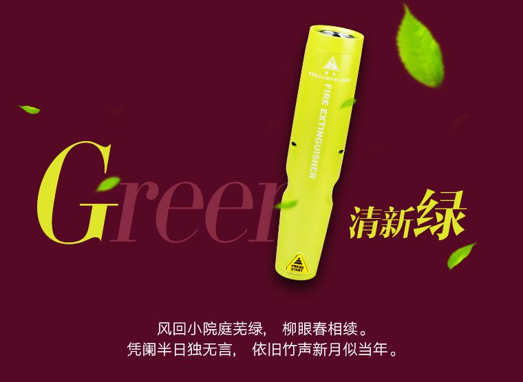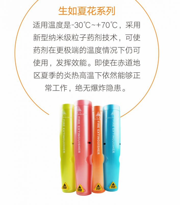 产品体积小巧,470g只相当于550ml矿泉水瓶大小,携带、操作便捷。四年免维护,常压储存,不惧颠簸和摇晃,不惧高温低温(适用温度-30℃至70℃)。安全无毒,绿色环保,灭火后清洁无残留。